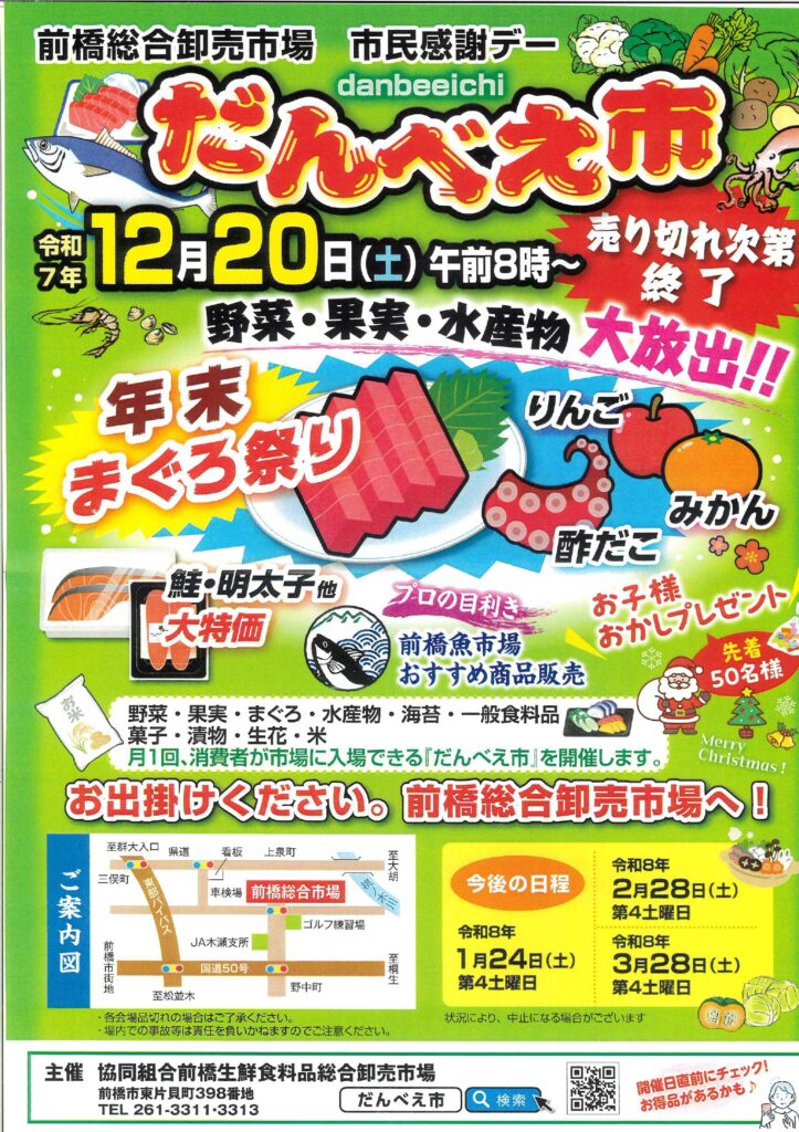 2025年12月4日 / 最終更新日 : 2025年12月4日 前橋市場 (閲覧数:1919)お知らせ 12月のだんべえ市は20日(第3土曜日)です 令和7年12月のだんべえ市は、 20日(第3土曜日)です。お間違えの無いようお願いいたします。 皆様のお越しをお待ちしております。