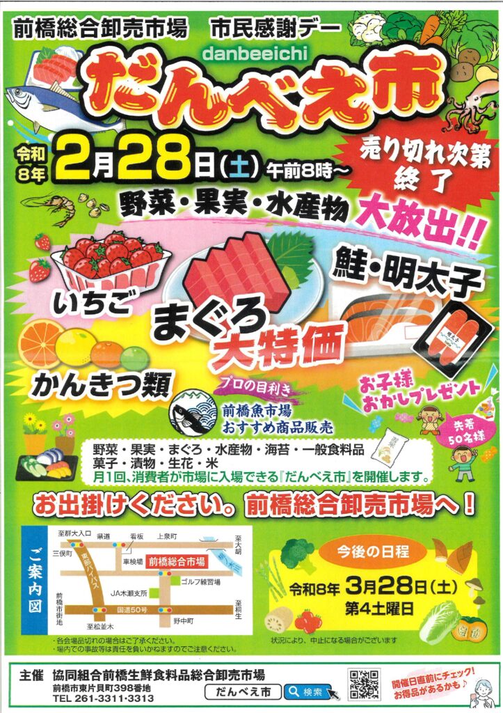 2026年2月5日 / 最終更新日 : 2026年2月5日 前橋市場 (閲覧数:22)お知らせ 令和8年2月のだんべえ市は28日(第4土曜日)です いつもホームページをご覧いただきありがとうございます。 2月の「だんべえ市」は 28日(第4土曜日)です。 今月も皆様のお越しをお待ちしております。